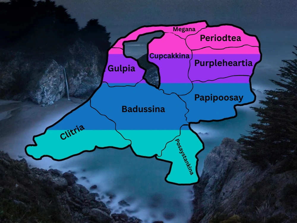 Badussyland, officially known as the Badussian Empire, is a country 100 kilometers away from Floptropica. Its capital and most populous city is Badussy City. Badussyland is known to have been extremely devastated by the three Badussy Wars, and most of the settlements in the country have been left destroyed. Badussyland is divided into 9 states, 2 territories, and 3 dependencies. The island only has about 120,000 inhabitants, and most of them are moving to Floptropica to find a better life. Some of the most famous attractions in Badussyland include the Castle of Cupcakkina, Badussyland Cove, the Royal Palace of Badussyland, the Nymphussium of the Merflops, and more.