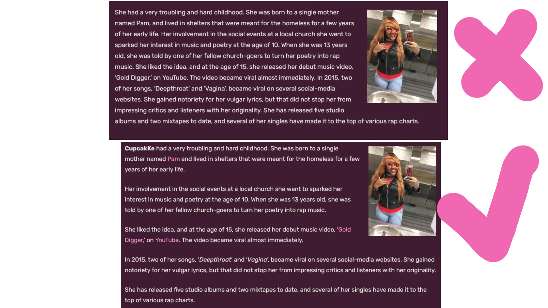 Your article has to be easy to read. Utilize italics and boldness. Put paragraph breaks if needed. Link relevant names to other articles.